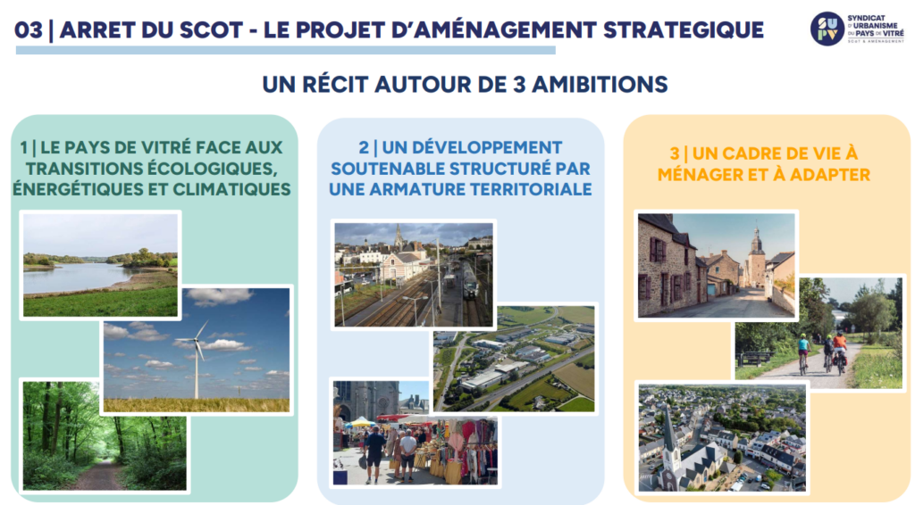 Planifié à l’horizon 2046, le SCoT fixe des orientations stratégiques et partagées pour le Pays de Vitré : un territoire engagé dans une trajectoire de sobriété territoriale, d’atténuation et d’adaptation au changement climatique, au service du bien-être de sa population, et visant à préserver durablement ses ressources, sa biodiversité et ses écosystèmes.