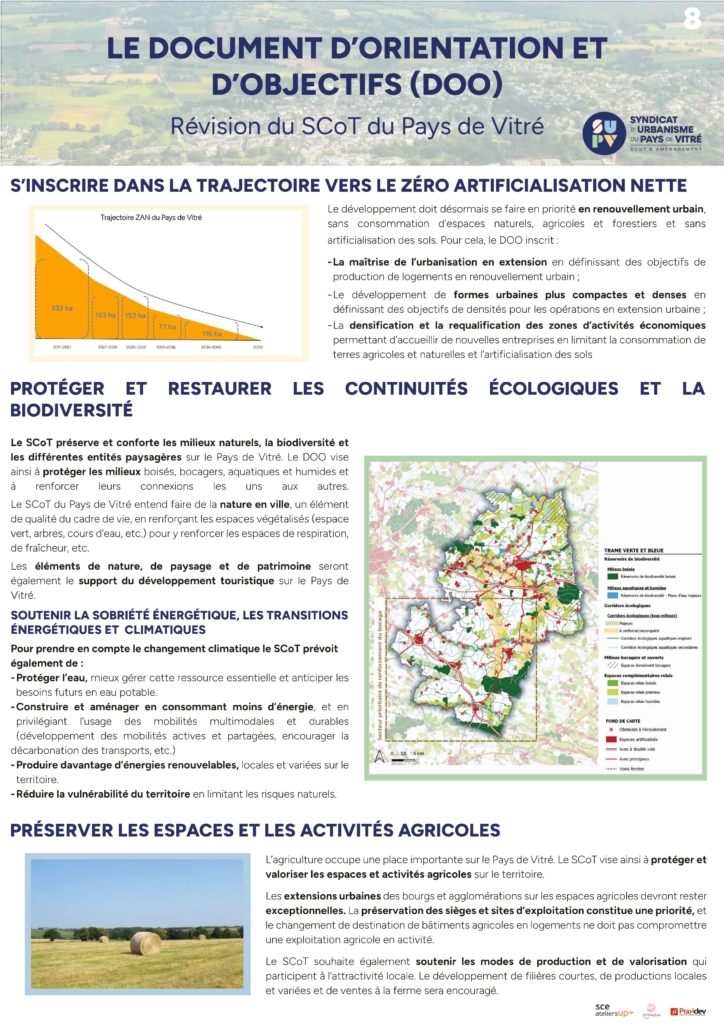 - Pour adapter le territoire aux transitions écologiques, climatiques et démographiques, le Pays de Vitré doit s’inscrire dans une logique de ménagement de ses ressources naturelles et de son développement urbain, avec notamment la mise en place de stratégies de développement orientées vers une remobilisation des espaces urbanisés et un cadre de vie de qualité.